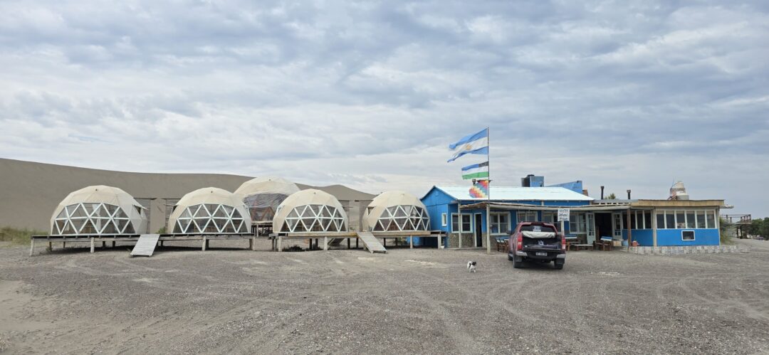 Un lugar que ofrece opciones para quedarse en domos, camping o casas rodantes graciosamente aparcadas sobre la playa.